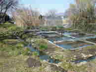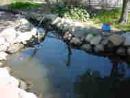 群馬高専の合併処理浄化槽で処理された生活排水の処理水を水源とした延長約80mの小川がつくられています。ポンプで循環させることによって、ここで処理水をさらに浄化し、生態系復元を目的とした大規模な実験が行われています。硝酸態窒素の除去能力が極めて高いカラーなどの植物によって窒素、リン等の栄養塩を除去・浄化し、ドジョウ、メダカ、タナゴ、ホタル、シジミなどを繁殖させて昔の小川を取り戻そうとする群馬高専版ビオトープです!
