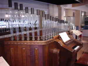 ストラスブール博物館にあるガスオルガンを復元(1987年)したもので、天然ガスで演奏できる世界最初のオルガンです。1876(明治9)年にフランスでピロフォンというガスを使った教会用のパイプオルガンで、鍵盤を押すとガラス管の中の炎が変化しながらやわらかい音を出すということです。