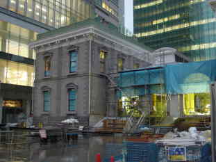 現在、旧・新橋停車場駅舎が復元工事中(2003年春に竣工予定)です。この復元工事は、残っていた駅舎の基礎部分(国の重要文化財)や、竣工当時の写真をもとに行われており、プラットホーム(25m)も復元され、資料展示室も設置される予定です。また、発掘されて現存する当時の駅舎へ入るための階段の一部も見ることができるように復元されます。旧・新橋-横浜間鉄道創設起点跡が鉄道記念物や史跡に指定されています。復元される駅舎の建物は、当時の石造建築の姿にできるだけ近づけるため、石材も4年間にわたって調査されて選ばれた3種類の石材を、それぞれ福島、札幌、神奈川から取り寄せて使われています。2003年4月10日に一般公開の予定です。