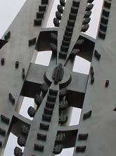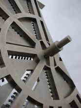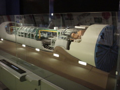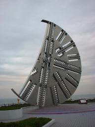 実際に東京湾アクアラインの海底トンネルを掘り進んだシールドマシンのカッターフェイスを復元したものです。8基のシールドマシンが浮島、風の塔と海ほたるの各人工島から発進し、それぞれの区間の中央付近まで掘り進み、海底の地盤の中で接合(接合する際には、周辺の地盤を凍結させ、漏水を防止してからドッキングさせます)して全長9.5kmの2本のトンネルを完成させました。マシンの直径は14.14mと世界最大規模です。掘削はカッターフェイスを回転させて掘り進み、1994年8月から1996年8月までの24ヶ月で掘進を無事完了させました。掘削により摩耗したカッタービットを見ることができます。