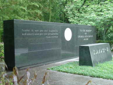 西暦1879年にトーマス・アルバ・エジソンが灯火の革命ともいえる炭素白熱電球を発明し、この石清水八幡宮境内に生えている竹が電球の命ともいえるフィラメントの材料として最も適していることを知り電球発明の翌年から十数年もの永い間この竹を使ってたくさんの炭素電球を造り世界の人々に電灯のありがたさを知らされました。つまり、この八幡の竹が炭素発熱電球の実用化に大きな役目をつとめたのです。 そこで1929年に電灯発明五十年を記念して世界各国で電灯黄金祭が催された時、日本もこれに加わり記念事業の一つとして電球の発明と切っても切れない関係にあるこの土地に記念碑を建てエジソンの功績を永久に伝え讃えることになったのです。 最初に建てられたのはこの境内北側に続く場所でしたがエジソン彰徳会の手で昭和三十三年にここに移され更に昭和五十九年十月に現在の姿に再建されました。 |