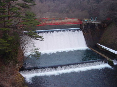 本堰堤基底部の洗掘による破壊を防止するために水をためて本堰堤から越流し落下する水の衝撃を緩和させています。