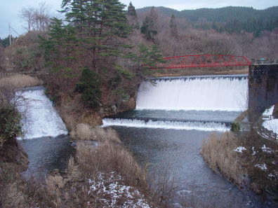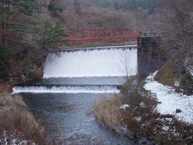 高さ16.3m、長さ65.1m、越流式の堰堤部分は中央部29.7m