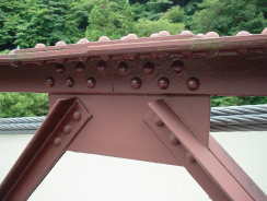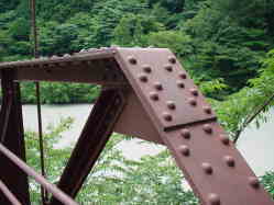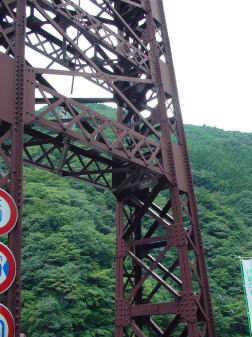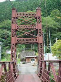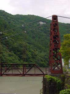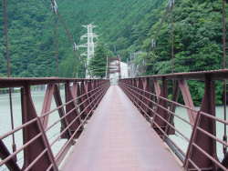 | 「市代吊橋」は、昭和11年大井川電力(株)大井川ダムの建設に伴い、木材の流送を補償するため、 鉄道用吊橋として建設された。 昭和29年鉄道を井川まで延長する際ルートが変更となり、市代吊橋は道路橋となった。それ以前、 昭和8年寸又峡に飛龍橋・昭和10年土本に三叉橋が鉄道用吊橋として建設されたが、これらは戦後 永久橋に改築されたため、残っているのは市代吊橋だけである。 若干の改造は行われているが、鉄道用吊橋の構造をよく残し、橋梁の歴史を語る貴重な吊橋である。 認定者 産業考古学会 認定年月日 平成12年5月20日 吊橋仕様 製造者 三菱重工業(株) 製造年 昭和11年 型式 サスペンショントラス 径間 106.74m 幅員 2.12m 制限重量 8トン |