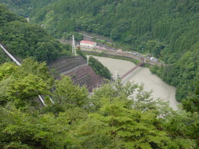 手前の踏切は大井川鉄道井川線で、市代吊橋の向こうに発電所があります。