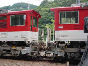 井川線ではアプト式区間の規格が高く、車両限界が大きいため、井川線の他の車両よりもやや大きく、アプト式電気機関車の高さが高く見えます。ED90形機関車3両は、スイス製のそれぞれ異なった音色の汽笛を装備しており、異なった音色の汽笛が渓谷にこだましています。