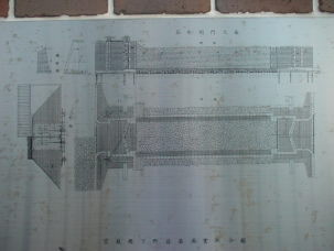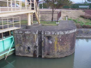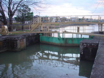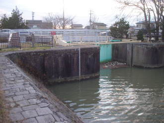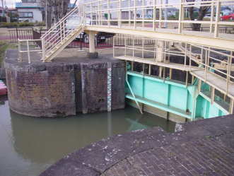 | 工期:1878(明治11)年10月〜1880(明治13)年7月 所在地:宮城県石巻市水押3丁目6 旧北上川右岸8.1km付近(北北上運河始点) 全体延長: 50.35m 躯体構造: 川表門柱部(煉瓦造) 幅6.10m 高さ6.30m 閘室部(石積) 幅7.15m 高さ4.65m(平均) 川裏門柱部(煉瓦造) 幅6.10m 高さ4.70m ゲート構造:木製マイターゲート敷き(川表・川裏とも) 1966(昭和41)年 鋼製ゲートに全面更新 管理者:国土交通省東北地方整備局北上川下流工事事務所 |