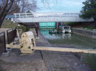 「閘門」は、水位差のある川や運河などで船舶を通すために設ける水位調節機能を持つ施設で、2つの水門の間に船舶を入れる「閘室」を持っています。