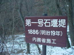 「第一号石堰堤」より上流には、1885(明治18)年から1889(明治22)年にかけて、当時の内務省土木局による直轄砂防工事として行われた「根止石積堰堤(ねどめいしづみせきてい)」があります。その規模は、幅約8m、高さ約7mであり、コンクリートを使わない「空石積(からいしづみ)」で石の大きさ、形がふぞろいであることが特徴です。さらに上流の日影沢、地獄谷、中の沢、泥沢に、このような堰堤があります。