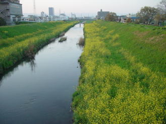 | 松本酒造の酒蔵が並ぶ新高瀬川の堰堤は、春になると一面に菜の花に彩られます。 2005年4月16日撮影 |