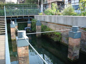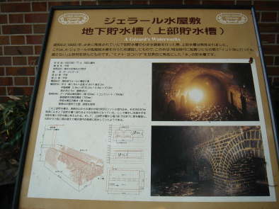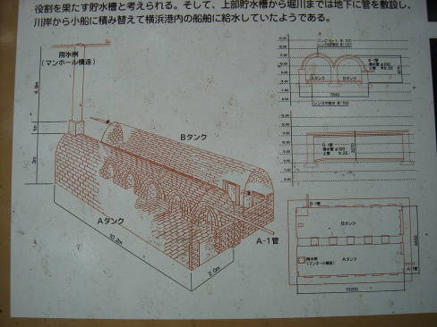 | 所在地:横浜市中区元町1-77-4 元町公園内 建造年:不明 使用目的:湧水の沈澄および貯水 施主:A・ジェラール 設計者:不明 施工者:不明 構造形式:煉瓦造ヴォールト構造2連 外寸 幅7.8m×全長11.6m×高さ3m 平面規模 2.8m×約10.2m+2.9m×10.2m 高さ約2.5m 面積65m2 使用材料:アーチ部は煉瓦積み(厚320mm)+コンクリート(100mm) 垂直壁体は煉瓦構造(720mm) 床版は煉瓦平敷き(厚150mm) 配管は6箇所で土管、鉄管を使用 |
