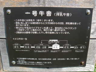 一号牛舎(搾乳牛舎) この牛舎には搾乳牛(母牛)がいます。 搾乳(乳しぼり)は朝5時からと夕方5時からの2回、搾乳機を使って行います。 搾られた牛乳はパイプラインを通って、衛生的にバルクタンク(冷却タンク)に集められ、毎日工場へ運ばれます。 2階部分は農場で収穫した干し草の倉庫になっています。 |