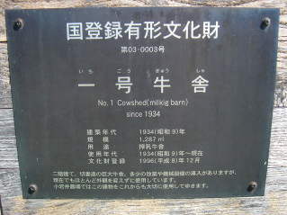| 一号牛舎 No.1 Cowshed(milkig barn) since 1934 建築年代 1934(昭和9)年 規模 1287m2 用途 搾乳牛舎 使用年代 1934(昭和9)年〜現在 国登録有形文化財 第03-0003号 1996(平成8)年12月登録 |