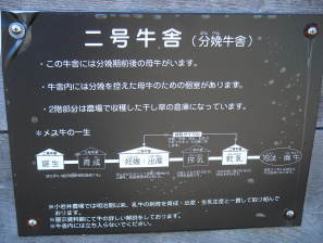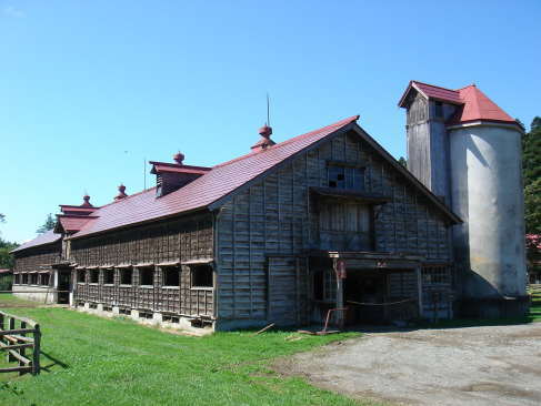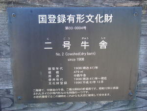 | 二号牛舎(分娩牛舎) No.2 Cowshed(dry barn) since 1908 建築年代 1908(明治41)年 規模 479m2 用途 分娩牛舎 使用年代 1908(明治41)年〜現在 国登録有形文化財 第03-0004号 1996(平成8)年12月登録 |