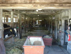 この牛舎には分娩期前後の母牛がいます。 牛舎内には分娩を控えた母牛のための個室があります。 2階部分は農場で収穫した干し草の倉庫になっています。 |