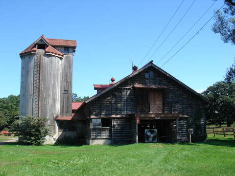| 2階建て、切妻造の巨大牛舎。 木製板張りのサイロが特徴の一つです。 |