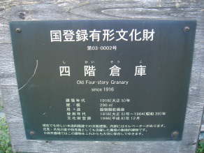 | 四階倉庫(しかいそうこ) Old Four-story Granary since 1916 建築年代 1916(大正5)年 規模 290m2 用途 穀物類乾燥庫 使用年代 1916(大正5)年〜1964(昭和39)年 国登録有形文化財 第03-0002号 1996(平成8)年12月 |