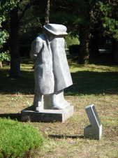 | 岩手大学農学部同窓会(北水会)が、盛岡高等農林学校以来の創立百周年記念事業の一環として建立し、岩手大学に寄贈したもの。制作者は、岩手大学教育学部の藁谷収(わらがい・おさむ)教授。賢治の花巻農学校時代も終わりに近い、大正十五年始めに、農学校付近の畑で撮ったといわれる写真がモチーフ。帽子を被ってうつむいているその代表的な写真は、ベートーヴェンにならっているのだという。素材は、賢治の色々な作品の中にも出てくるなど、賢治とも関係の深い安山岩で、岩手県北の安代(あしろ)町の山中で求められ、彫刻には難しい点もあるこの素材のほとんどが手彫りでなされている。横から見ると賢治の立ち姿のシルエットが浮かび上がるところは、抽象と具象との間に真実を探ろうとしたもので、長年の構想を温めながら、直接的には半年ほどの製作であったという。横に広がる像は賢治精神が未来へとつながっていくイメージを表現していて、賢治の志を後に続く者が受け継いでいくという思いも制作意図には秘められているという。 | |