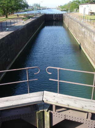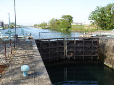 この閘門は、運河の河口から約3.1km上流に位置し、およそ2.5mの水位差を二対の扉で調節するパナマ運河式の閘門で、ヨーロッパにおいて中世から近代にかけて発達した水運技術を取り入れたものです。