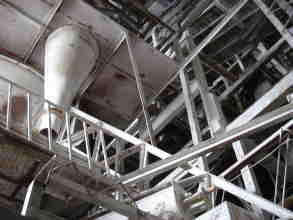 エレベーターで上部のトロンメルに送られ、粒度を選別し、各粉砕機(ボールミル、フレットミル、ヤリヤ式粉砕機)に送る。