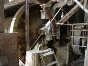 石灰砕石をさらに細かい石粉にするための機械。最初に導入されたのは創業当初の昭和2年頃で、当時の工場としては、画期的な最新鋭の機械でした。本体であるローラーが回転し、砕石を粉砕しました。これによって、それまでの粗い砕石から、細かな石灰岩沫の生産が可能となり、小岩井農場でも効果が大きいと好評だったそうです。ここではその頃のフレットミルの様子を再現しています。