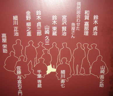 宮沢賢治・・・・工場を訪れた賢治は、背広にネクタイという立派な格好でしたが、気取らず、話しやすく心のやさしい人でした。賢治が帰った後の工場には、賢治を思慕する不思議な空気が残っていたそうです。