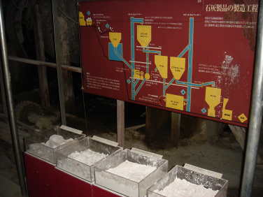細かいもの→サイロ→ボールミル(粉砕機)(ヤリヤ式粉砕機:ボールミルが導入される昭和25年頃まで使われていた。あずき大の砕石をさらに粉砕する機械。細かくなった粉はエアセパレーターに贈られる。フレットミルと併用して使用された。昭和15年頃〜昭和25年頃使用、30馬力 展示:ヤリヤ式粉砕機の歯)→フレットミル(粉砕機)4基(フレットミルは補助的に使われていた。)