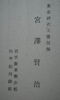 | 名刺 東北砕石工場技師 宮澤賢治 岩手懸東磐井郡 陸中松川駅前 |