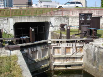 閘門は大きく閘室と門扉で構成され、閘室の主部分は鉄筋コンクリート造で、門扉を支える部分は、耐久性と水密性を考慮して石組み構造となっています。