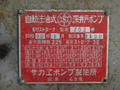 自動注油式 深井戸ポンプ 6吋ストローク 型式202番 昭和30年1月 製作番号 1100 毎分回転数 225 毎分ストローク 32 サカヱポンプ製作所 岐阜 名古屋 |