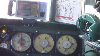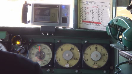 電車運転士が、架線からの給電を遮断したため、一番右側の電圧計が0Vになりました。