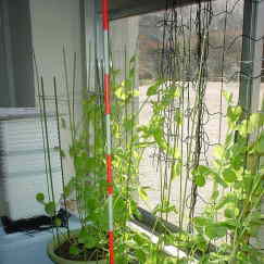 支柱は、あんどんづくり風になるように立てました。「つる」をぐるぐる巻いていくようにして、高さを低く抑えられるように考えています。もっと成長して問題が起きたら、また工夫したいと思います。