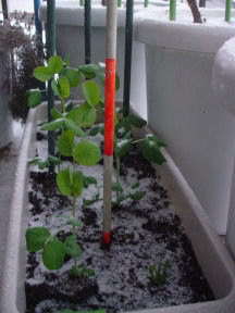 | 2005/12/31 大雪が降りました。この冬2度目ですが、平年よりずいぶん遅い雪です。 2階ベランダの屋根の下で栽培しているため雪の心配はありませんでした。 支柱の赤白表示はそれぞれ10cmです。 |