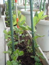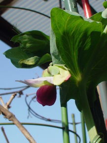 ここでは、いわゆる「ツタンカーメン王陵のエンドウ」と呼ばれているものを栽培しています。紫色の「花」や「さや」が、現在一般に栽培されているエンドウとは明らかに異なる品種であることを示す珍しいエンドウです。