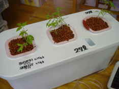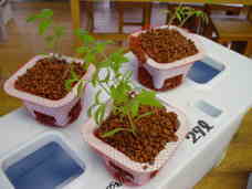 培養土ポットで大きくなった苗を養液栽培(水耕栽培)用のプランターへ移します。